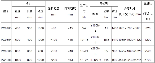 PC型錘(chuí)式破碎機技術性能及參(cān)數